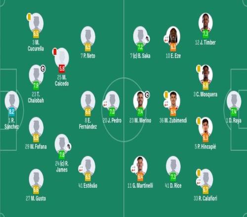 切尔西首发:1-桑切斯、27-古斯托、29-福法纳、23-查洛巴、3-库库雷利亚、24-詹姆斯、25-凯塞多、41-埃斯特旺(46'49-加纳乔)、8-恩佐、7-内托、20-佩德罗(55'9-德拉普)